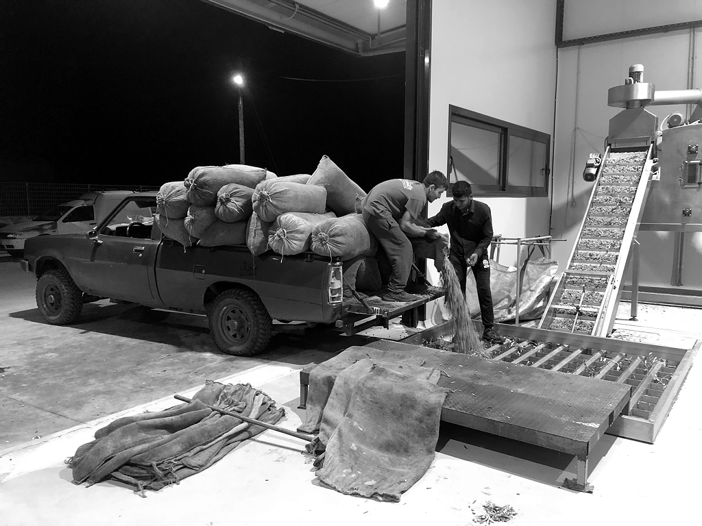 Les olives sont ensuite immédiatement nettoyées grossièrement des branches et des feuilles, mises dans des sacs et transportées au moulin à huile le soir même.